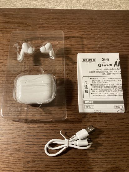 商品の中には ・イヤホン×2 ・専用ケース ・ケース充電用USBケーブル(Type‐C) ・取扱説明書(日本語)が入っています。
