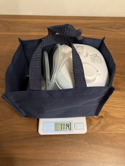 電動部本体の重さは830gと軽量で、電源ケーブルやその他付属部品をすべて収納バッグに入れた状態でも1kgちょっとなので、持ち運びも全く苦になりません。